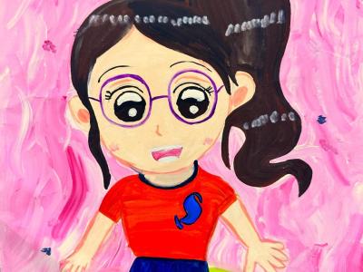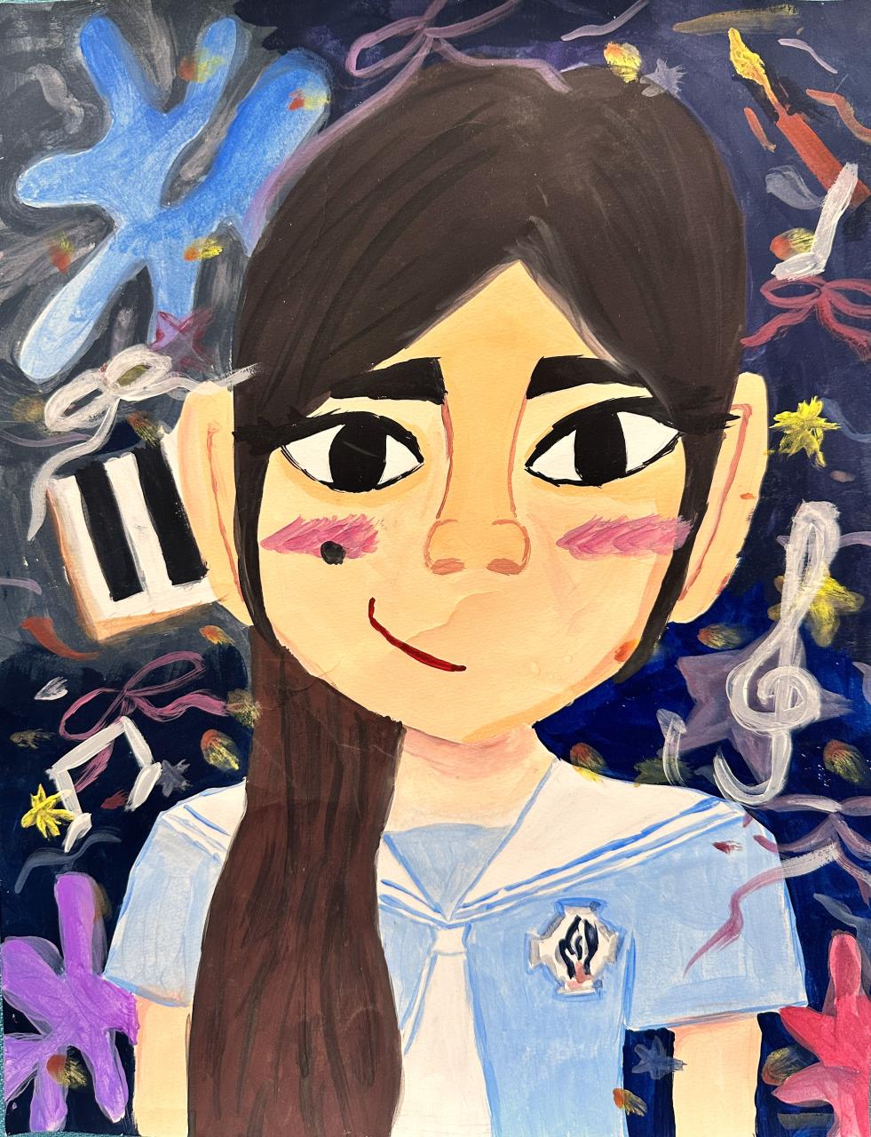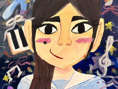 欣霖繪畫的《人物漫畫》造型可愛,充滿趣味。她有效地以誇張的手法突出五官的特徵:炯炯有神的大眼睛、粗黑的眉毛和嘴角上揚。此外,她善用線條來繪畫頭髮的紋理,令頭髮具層次感及充滿動感。最後,她使用了較暗沉的顏色作為底色,並襯托不同的音符和圖案,更能突顯欣霖的興趣。