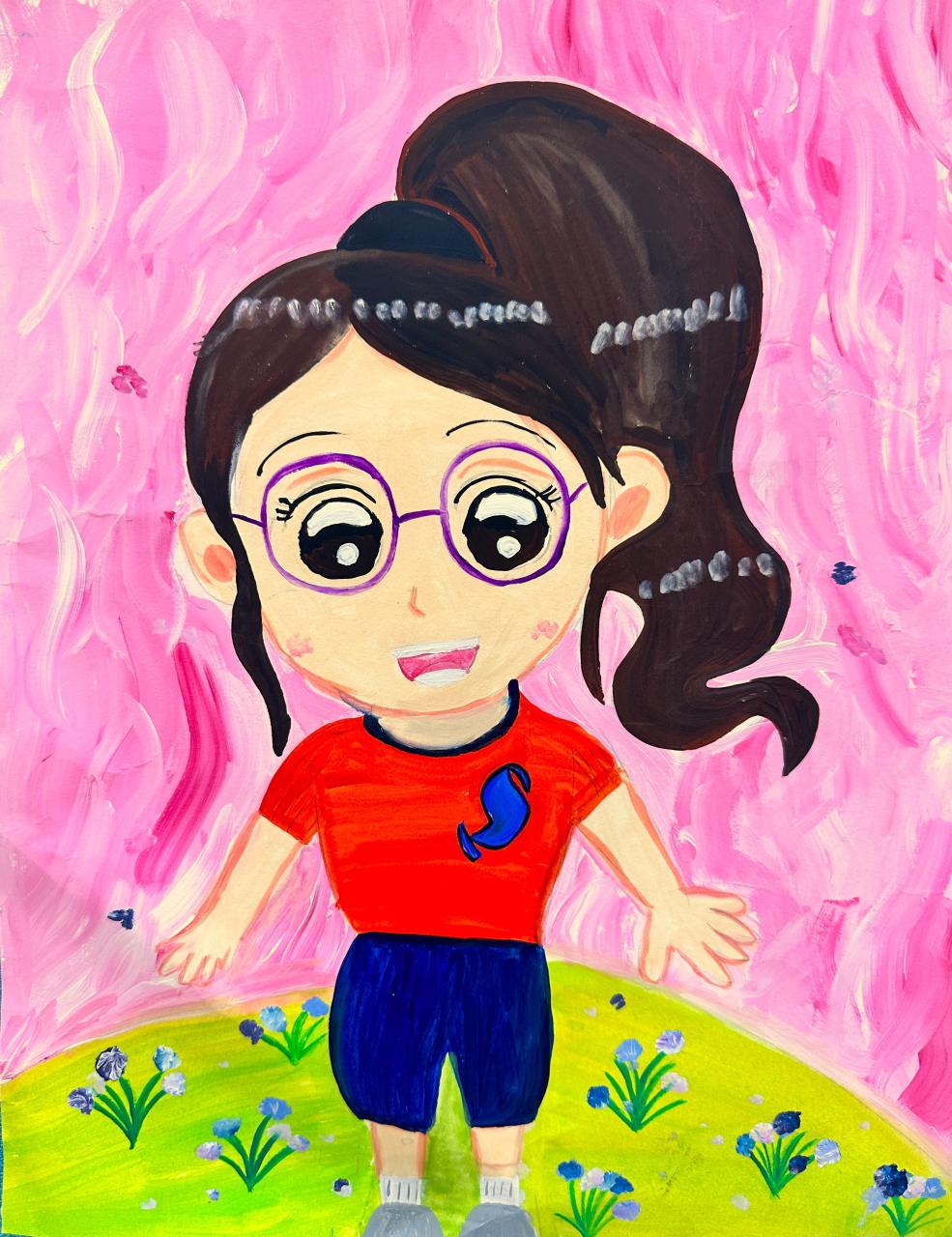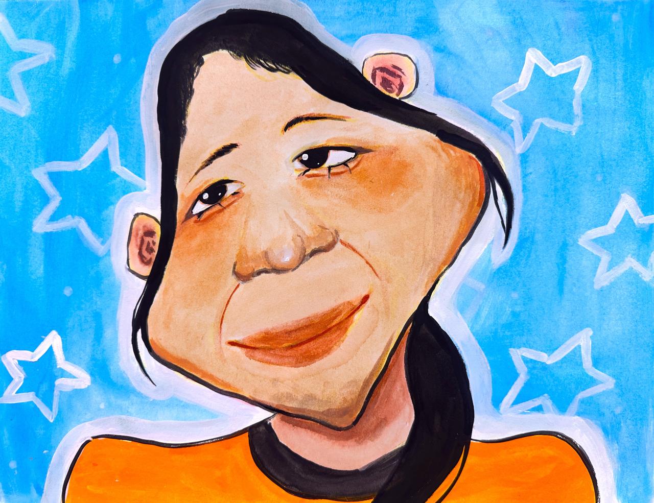 恩娜繪畫的《人物漫畫》造型獨特。恩娜以誇張和變形的手法處理頭部輪廓,她拉闊了臉頰,並配上大鼻子,這樣不僅沒有違和感,反而突顯了人物的特徵與幽默感。她的上色技巧也十分值得讚賞:面部的膚色處理得非常有層次,而額頭、臉頰與鼻頭的光影變化(尤其是高光部分)營造出不錯的立體感,讓臉部看起來圓潤飽滿。從這幅作品中,充分展現了恩娜敏銳的觀察力。