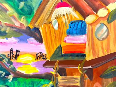子平的《我的樹屋》繪畫得栩栩如生,滿有立體感,卻又不失創意。木造的樹屋呈現出逼真的木紋質感,明暗有致,讓人感受到原木的粗糙質感。同時,子平對於樹葉的處理亦十分得宜,色彩變化能營造出層次感,落日的餘暉映照在葉子上,也把部分葉子染成一片金黃。另外,子平在背景中加上了香港的景色,配以醉人日落,份外浪漫。
